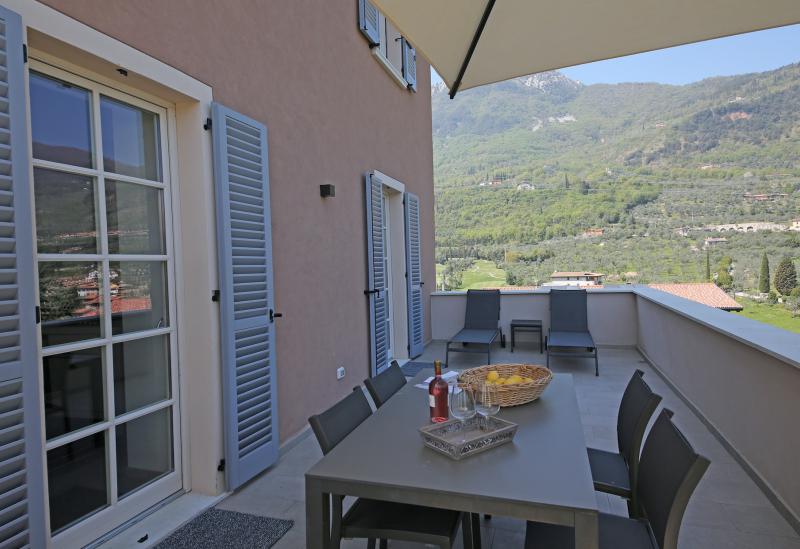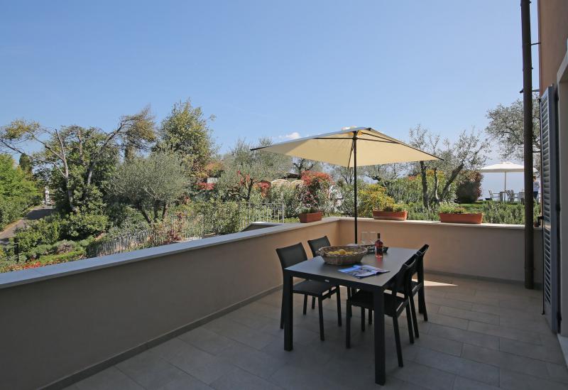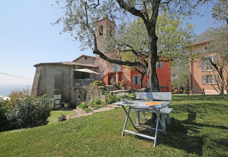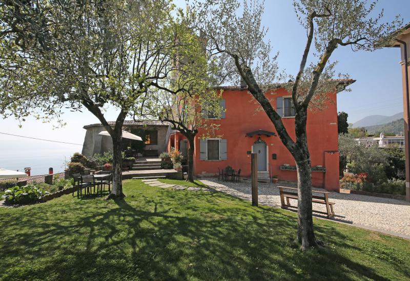 Dalla strada panoramica che gira intorno al lago di Garda, dopo un breve tratto salendo, si arriva all'agriturismo. Suggestiva è la splendida vista sul lago e sulle montagne innevate, ero lì in primavera. Il lago di Garda non è lontano, ma qui si è immersi in un rilassante silenzio. Dall'altra parte dell'agriturismo c'è una bella vista su un campo da golf panoramico.