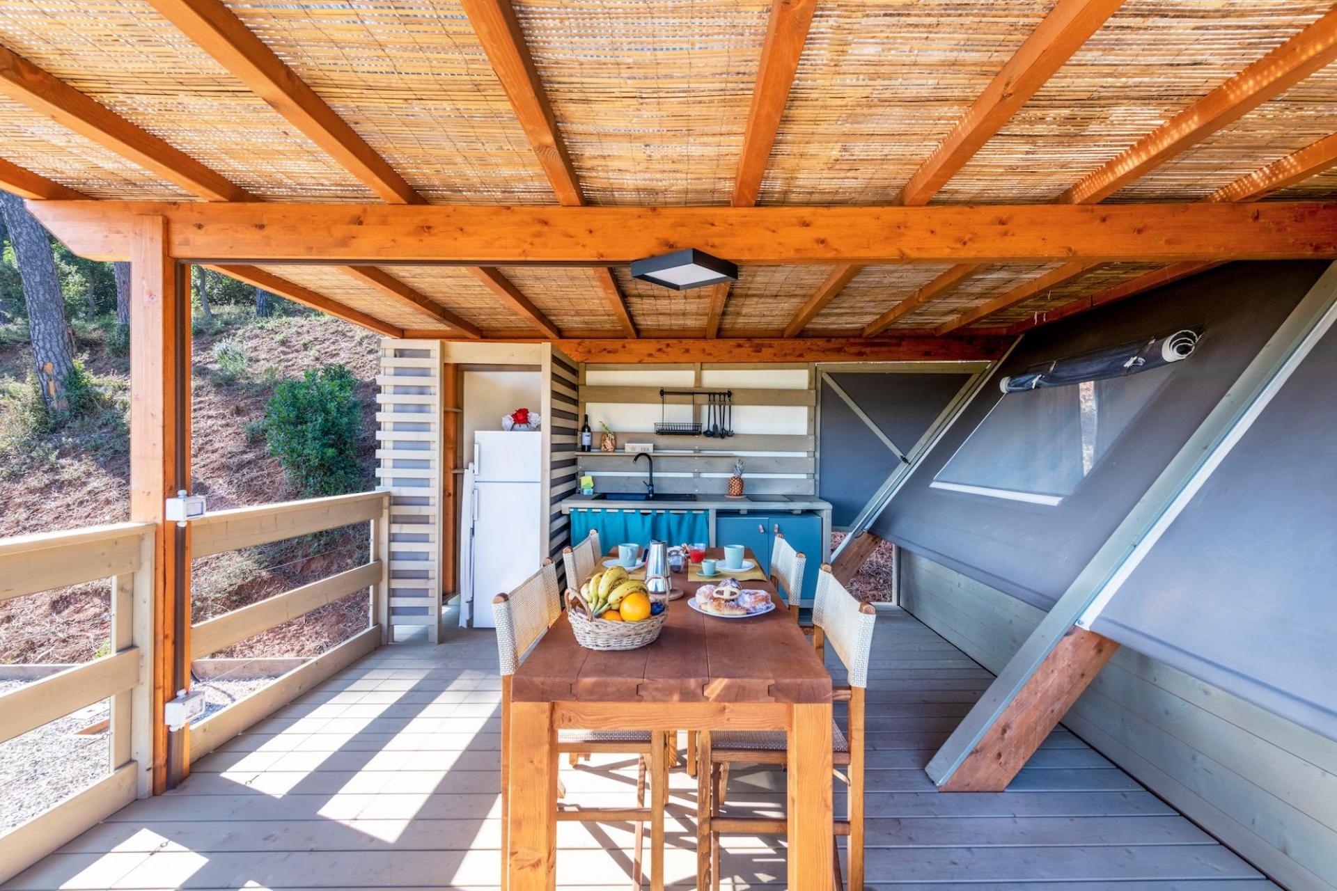 Ogni tenda dispone di una veranda con vista aperta ed è dotata di una cucina attrezzata con piano a induzione, frigorifero e stoviglie, di un bagno privato con doccia e di comfort moderni come aria condizionata, Wi-Fi e cassaforte.