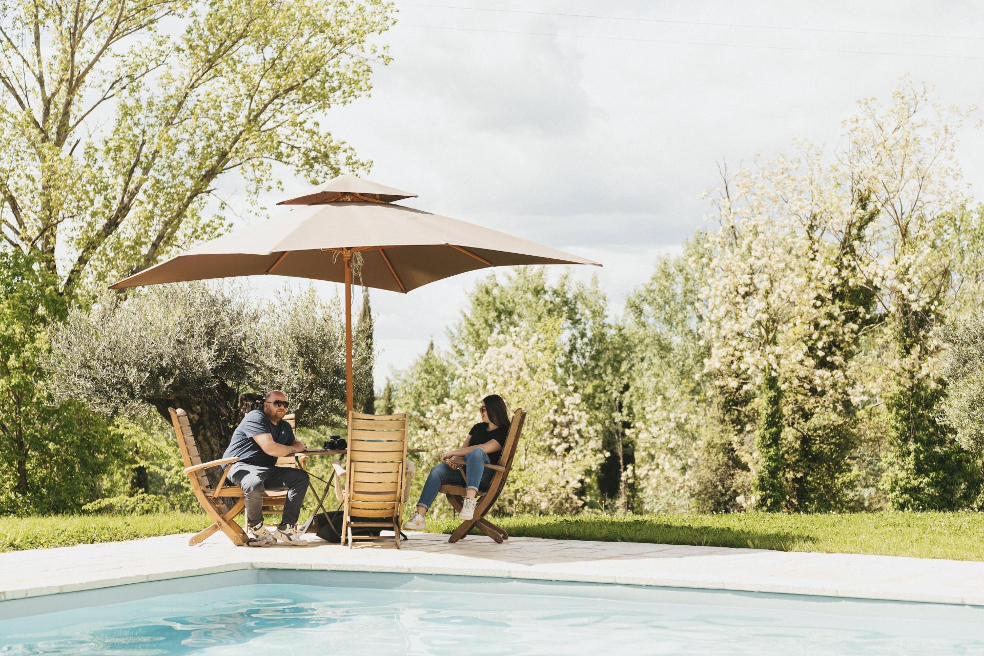 La piscina si trova in posizione leggermente rialzata e regala una bella vista sulle colline e sulla natura circostante. È il luogo ideale per leggere un libro o semplicemente rilassarsi, con lettini e zone d’ombra.