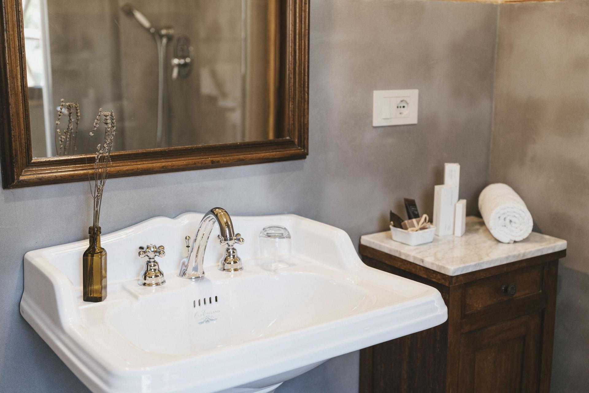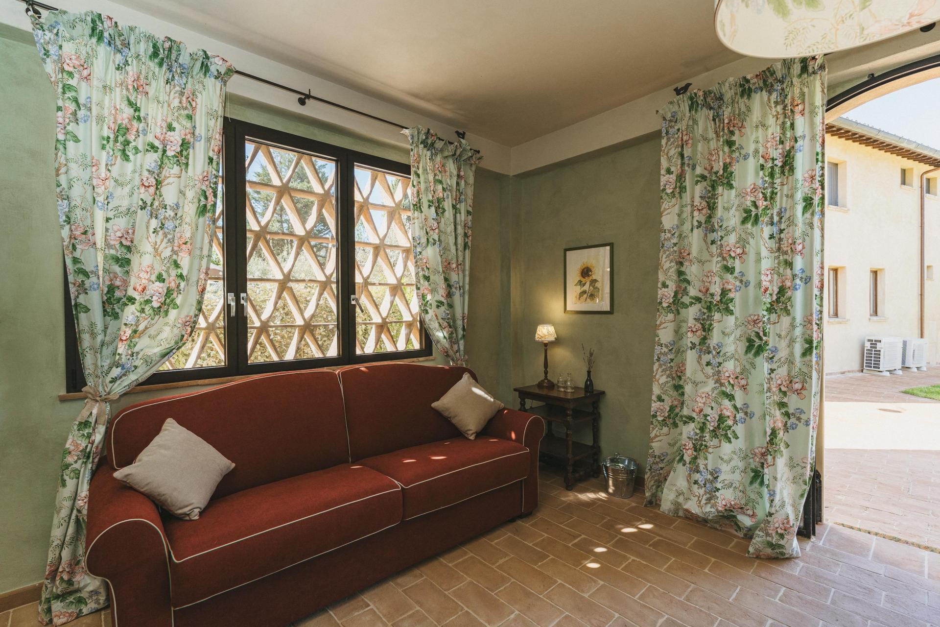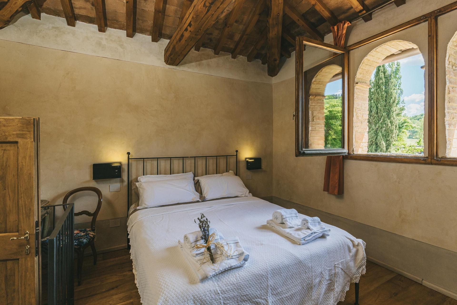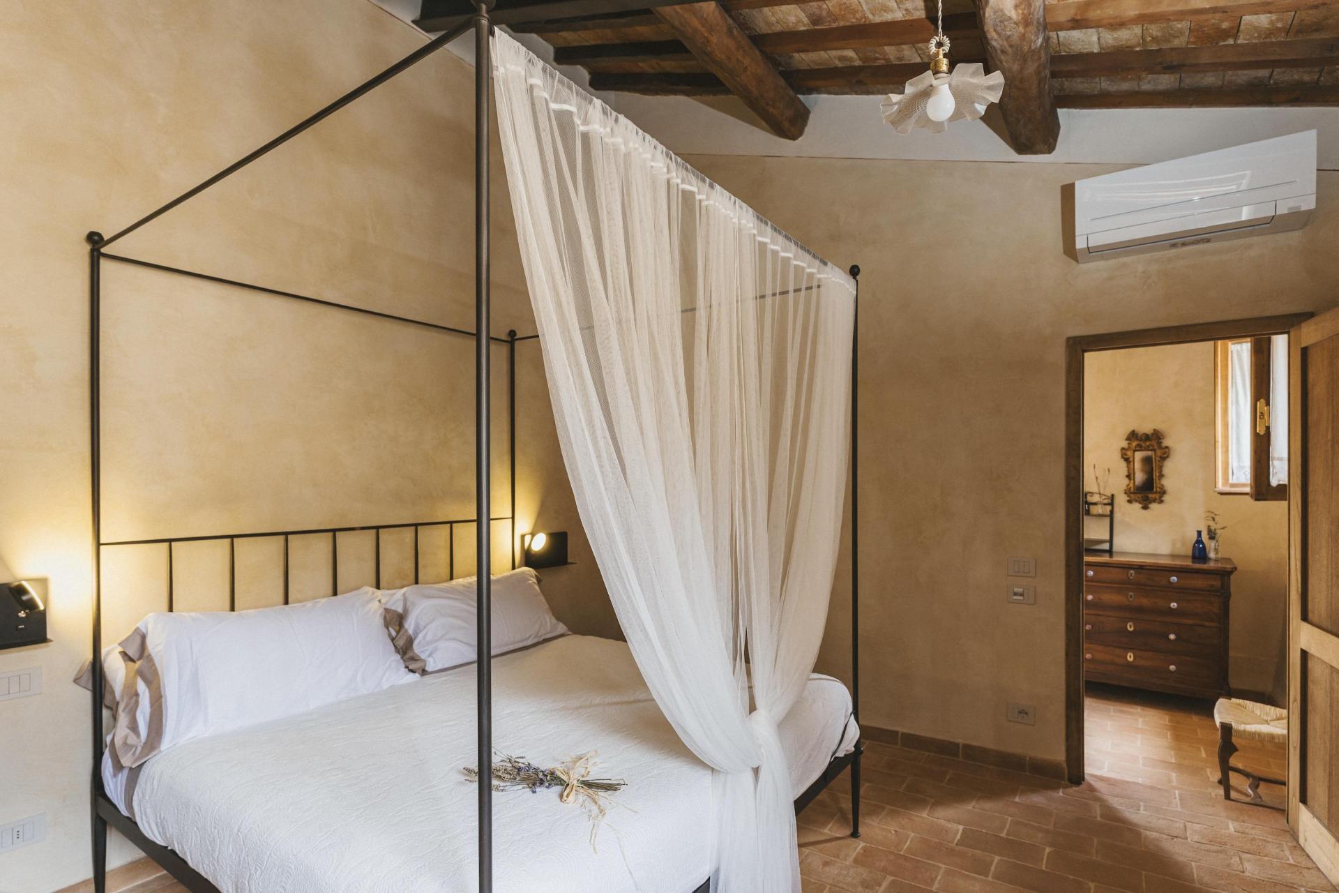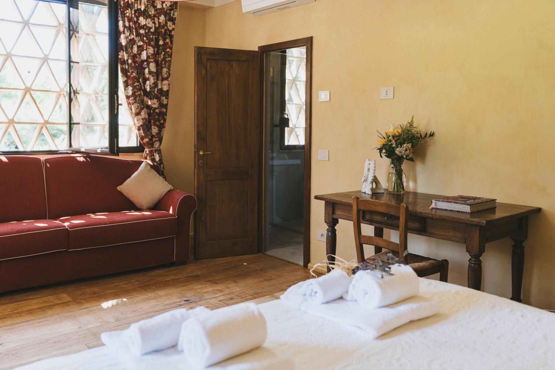 L’agriturismo dispone di 12 camere, distribuite in diversi edifici del borgo. Non ci sono camere standard: ognuna ha una propria disposizione e un carattere distinto. L’arredamento è sobrio e armonioso, con materiali naturali in linea con l’ambiente circostante.