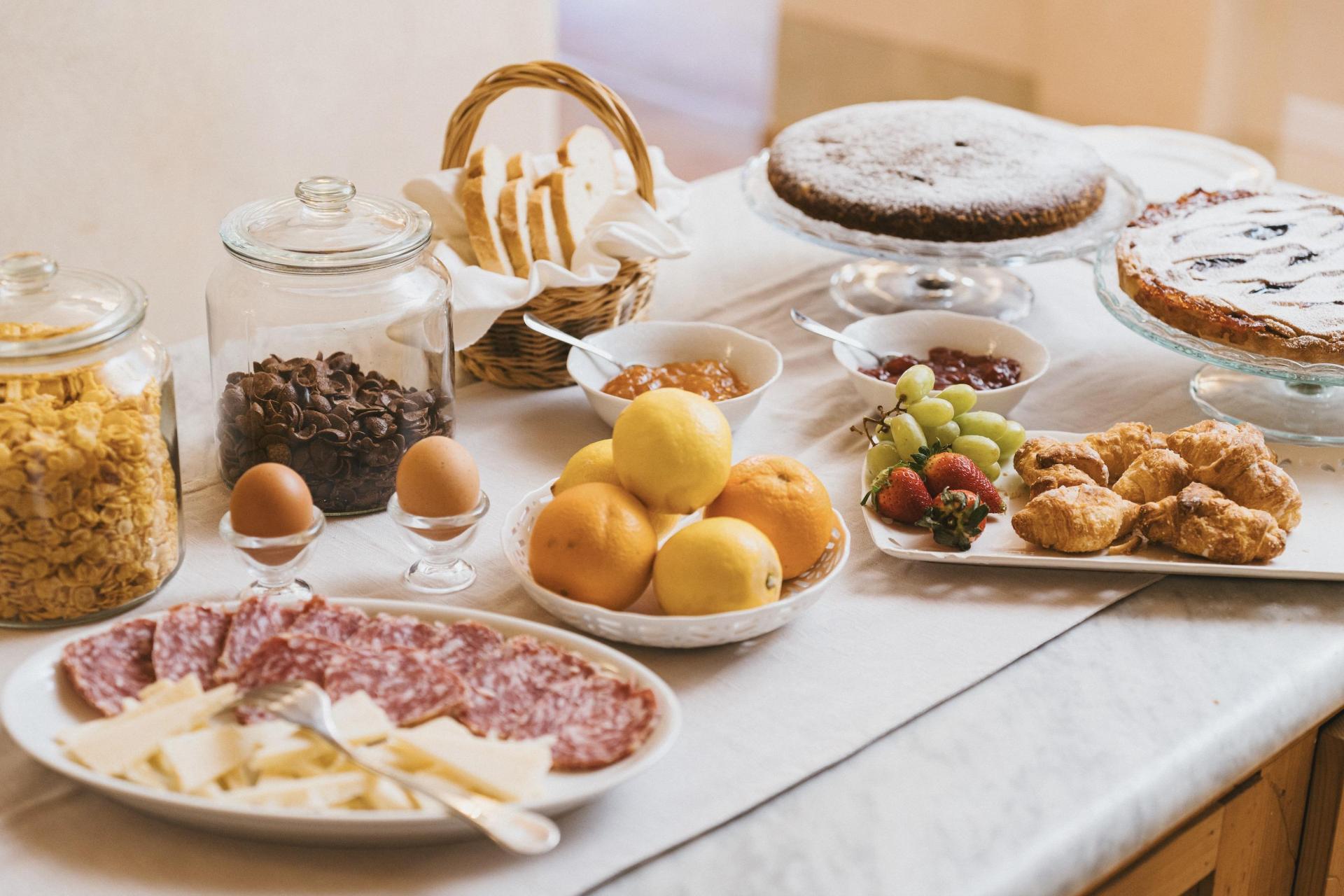Anche la colazione a buffet è ricca e stagionale, con proposte dolci e salate: frutta fresca, torte e biscotti fatti in casa, pane e croissant, formaggi e salumi del territorio e uova delle galline della struttura. Naturalmente non mancano cappuccino ed espresso. Nei mesi più caldi la colazione viene servita all’aperto, in giardino.